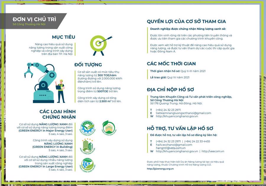 Để góp phần nâng cao hiệu quả sử dụng năng lượng, tôn vinh các cơ sở sử dụng năng lượng có thành tích nổi bật theo tiêu chí của Thành phố, Sở Công Thương Hà Nội đề nghị các đơn vị tích cực tham gia công nhận danh hiệu Cơ sở, công trình xây dựng sử dụng NĂNG LƯỢNG XANH năm 2021.