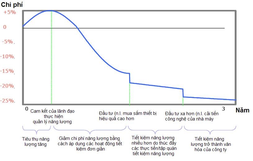 Trong doanh nghiệp được trang bị một hệ thống quản lý năng lượng (QLNL), hay nói cách khác, có QLNL bền vững thì suất chi phí năng lượng sẽ được giảm liên tục. Trong hệ thống này, hoạt động tiết kiệm năng lượng được thực hiện thường xuyên, liên tục. Mục tiêu tiết kiệm năng lượng được thiết lập, đạt được bằng một chiến lược và các mục tiêu được nâng cao hơn và chương trình tiếp tục diễn ra. Lãnh đạo cao cấp của doanh nghiệp phải nhận thấy tầm quan trọng và hình thành một nhóm các chuyên gia nhằm đảm bảo sử dụng thích hợp năng lượng và đảm bảo tiết kiệm năng lượng. Hình 1 sau đây mô tả trực quan lợi ích của một hệ thống QLNL bền vững.