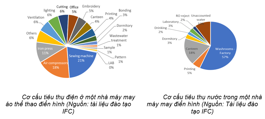 Các đối tượng tiêu thụ năng lượng chính trong một nhà máy may mặc điển hình là máy may và máy nén khí. Các bộ phận tiêu thụ năng lượng chính gồm: Máy nén khí, Máy may, Bàn là, Chiếu sáng. Các khu vực tiêu thụ nước chính là nhà vệ sinh và nhà bếp.