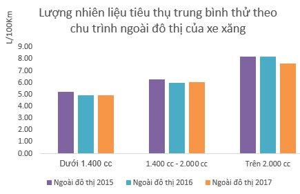 Hình 3. Sự thay đổi mức tiêu thụ nhiên liệu trung bình của xe xăng từ năm 2015 - 2017 theo các chu trình thử khác nhau