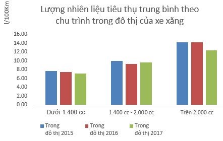 Từ 01/01/2015, Cục Đăng kiểm Việt Nam đã đăng thông tin về mức tiêu thụ nhiên liệu của các loại xe thuộc đối tượng phải dán nhãn trên trang thông tin điện tử của Cục Đăng kiểm Việt Nam (mục tra cứu thông tin về mức tiêu thụ nhiên liệu xe cơ giới)[1]. Thực tế đã chứng minh, trong 03 năm triển khai chương trình (từ năm 2015 - 2017), mức tiêu thụ nhiên liệu của xe ô tô con loại từ 07 chỗ trở xuống đã có những cải thiện như minh họa tại Hình dưới dưới đây.