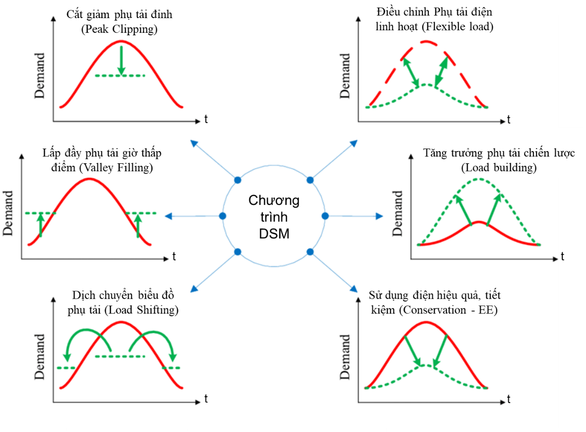 • Chương trình DSM là tập hợp các giải pháp Kỹ thuật - Công nghệ - Kinh tế - Xã hội nhằm hỗ trợ khách hàng và đơn vị điện lực sản xuất, kinh doanh điện và sử dụng điện một cách hiệu quả và tiết kiệm. Chương trình DSM bao gồm các hoạt động gián tiếp và trực tiếp của các khách hàng sử dụng điện và quá trình đó được khuyến khích bởi các Đơn vị cung cấp điện (phía cung) thông qua các cơ chế chính sách với mục tiêu phân bố lại nhu cầu phụ tải điện vào giờ cao điểm, giờ thấp điểm và giờ bình thường để góp phần san bằng biểu đồ phụ tải điện, tăng hệ số phụ tải điện của hệ thống điện và tối ưu hóa hiệu quả sử dụng năng lượng.