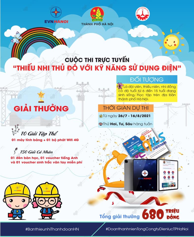 Thành đoàn Hà Nội, Hội đồng Đội Thành phố Hà Nội phối hợp với Đoàn Thanh niên Tổng công ty Điện lực TP Hà Nội, Đoàn Thanh niên Sở Công Thương Hà Nội và nhà tài trợ ILS Việt Nam tổ chức cuộc thi “Thiếu nhi Thủ đô với kỹ năng sử dụng điện” nhằm góp phần lan tỏa thông điệp về sử dụng điện tiết kiệm, an toàn, giúp các bạn nhỏ có sân chơi bổ ích lý thú.
