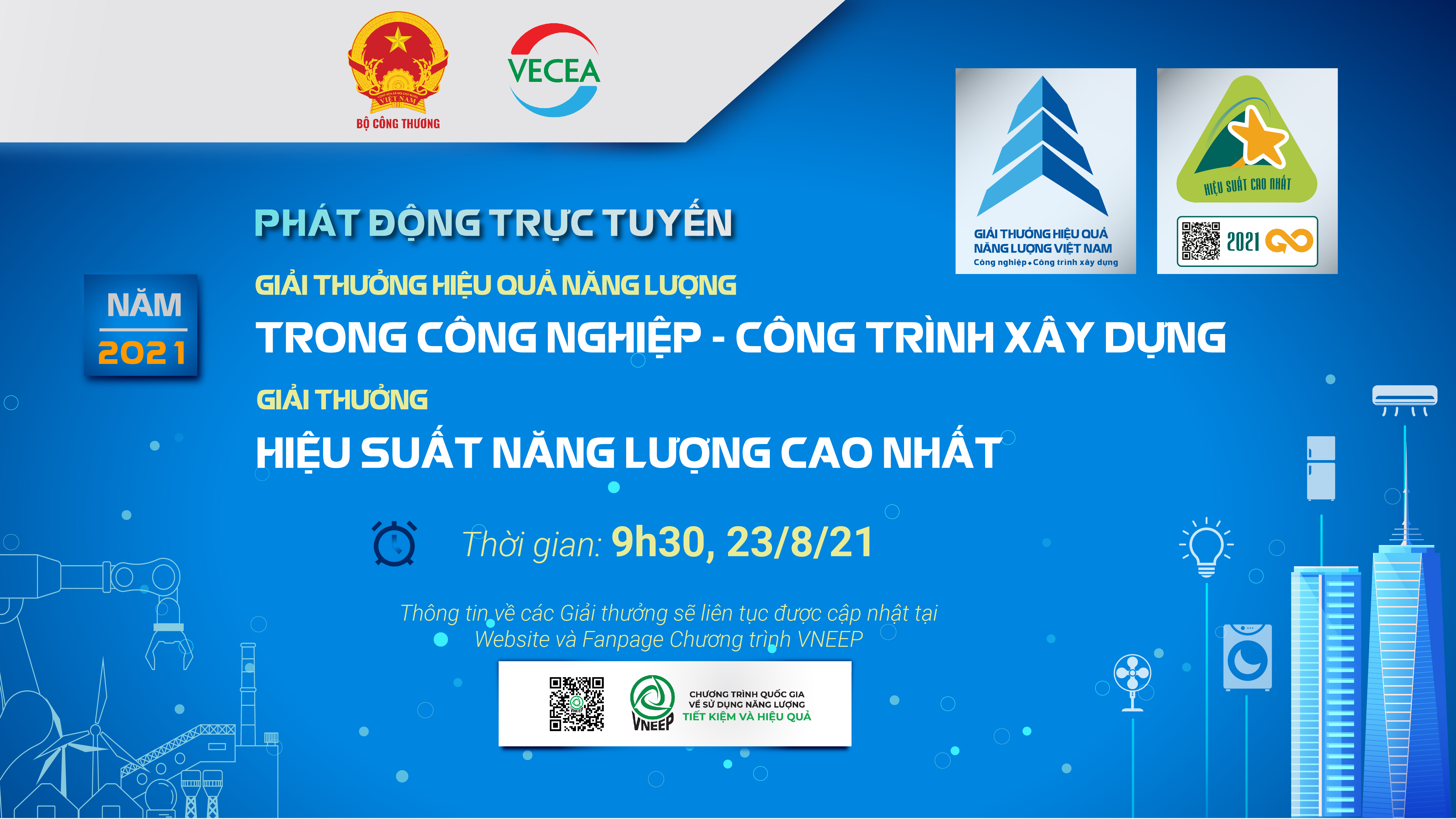 Phát động trực tuyến Giải thưởng Hiệu quả năng lượng trong công nghiệp - công trình xây dựng năm 2021 và Giải thưởng hiệu suất năng lượng cao nhất năm 2021 sẽ diễn ra vào 9.30 ngày 23/8/2021, phát sóng trực tiếp trên Fanpage Chương trình VNEEP.