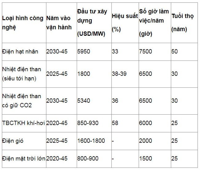Dưới đây giới thiệu tóm lược một số chỉ tiêu kinh tế - kỹ thuật của một số loại hình công nghệ sản xuất điện để phân tích, tham khảo. Tư liệu đã được Dự thảo Quy hoạch Điện VIII sử dụng theo Cẩm nang Kỹ thuật do Cục Năng lượng Đan Mạch phối hợp với Viện Năng lượng chuẩn bị [3].