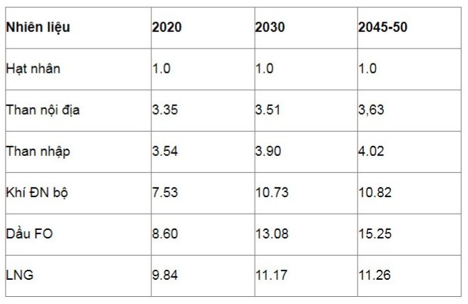 Bảng dưới đây là giá nhiên liệu cơ sở cho sản xuất điện, được quy về USD năm 2016, không tính trượt giá, theo khuyến nghị của IEA. (Đơn vị: USD/GJ).