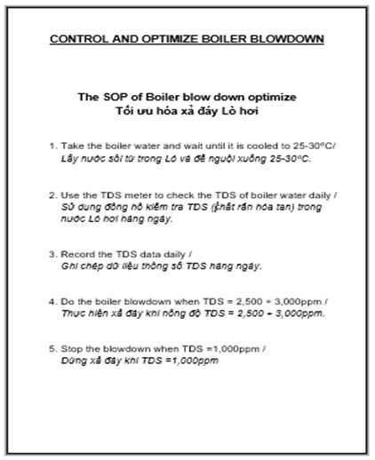 Kết quả thực hiện Sau khi tối ưu hóa xả đáy của nồi hơi TDS của nước trong nồi hơi được kiểm soát từ 2.500 - 3.000 ppm thay vì 573 - 1.850 ppm như đánh giá ban đầu. Khi TDS đạt được giá trị từ 2.500 - 3.000 ppm, người vận hành sẽ thực hiện quy trình xả đáy. Quá trình xả đáy sẽdừng khi giá trị TDS là 1.000. Chi tiết về SOP như hình sau: