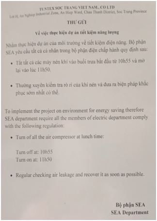 | Project Summary: In response to the energy efficiency program of Adidas brand, a textile and dyeing enterprise in Soc Trang Province has implemented the project of pneumatic system improvement. The goal of the project is to reduce energy costs and greenhouse gas emissions. | |