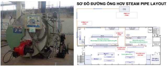 Hiện trạng trước khi thực hiện Nhà máy sử dụng 1 lò hơi đốt dầu DO cung cấp hơi cho khu vực canteen. Lò hơi có công suất 1,5 tấn/giờ. Hiện tại, lò hơi hoạt động ở chế độ non tải do chỉ vận hành trong khoảng 4,5 giờ/ngày (3 giờ vào buổi sáng và 1,5 giờ buổi chiều). Sản lượng hơi cấp trung bình trong thời gian khảo sát là 1.779 kg/ngày. Mức tiêu thụ dầu là 254 kg DO/ngày. Do vận hành non tải nên hiệu suất lò hơi hiện rất thấp (43,1% - theo phương pháp trực tiếp).
