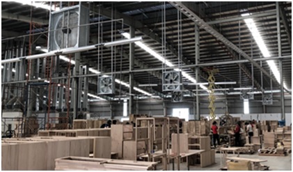 Trong quá trình sản xuất đồ gỗ nội thất, một lượng lớn bụi gỗ sinh ra ảnh hưởng đến môi trường làm việc của công nhân. Hệ thống quạt thông gió yêu cầu số lượng lớn nên tiêu tốn lượng điện năng đáng kể (với thời gian hoạt động khoảng 10h/ngày, số ngày hoạt động 300 ngày/năm). Việc sử dụng các động cơ AC 3 pha thông thường có hiệu quả sử dụng không cao trong khoảng 70 – 75 %. Do đó nhà máy đã lựa chọn quạt thông gió STEELFAN – 138A trang bị động cơ DC inverter không chổi than. |
